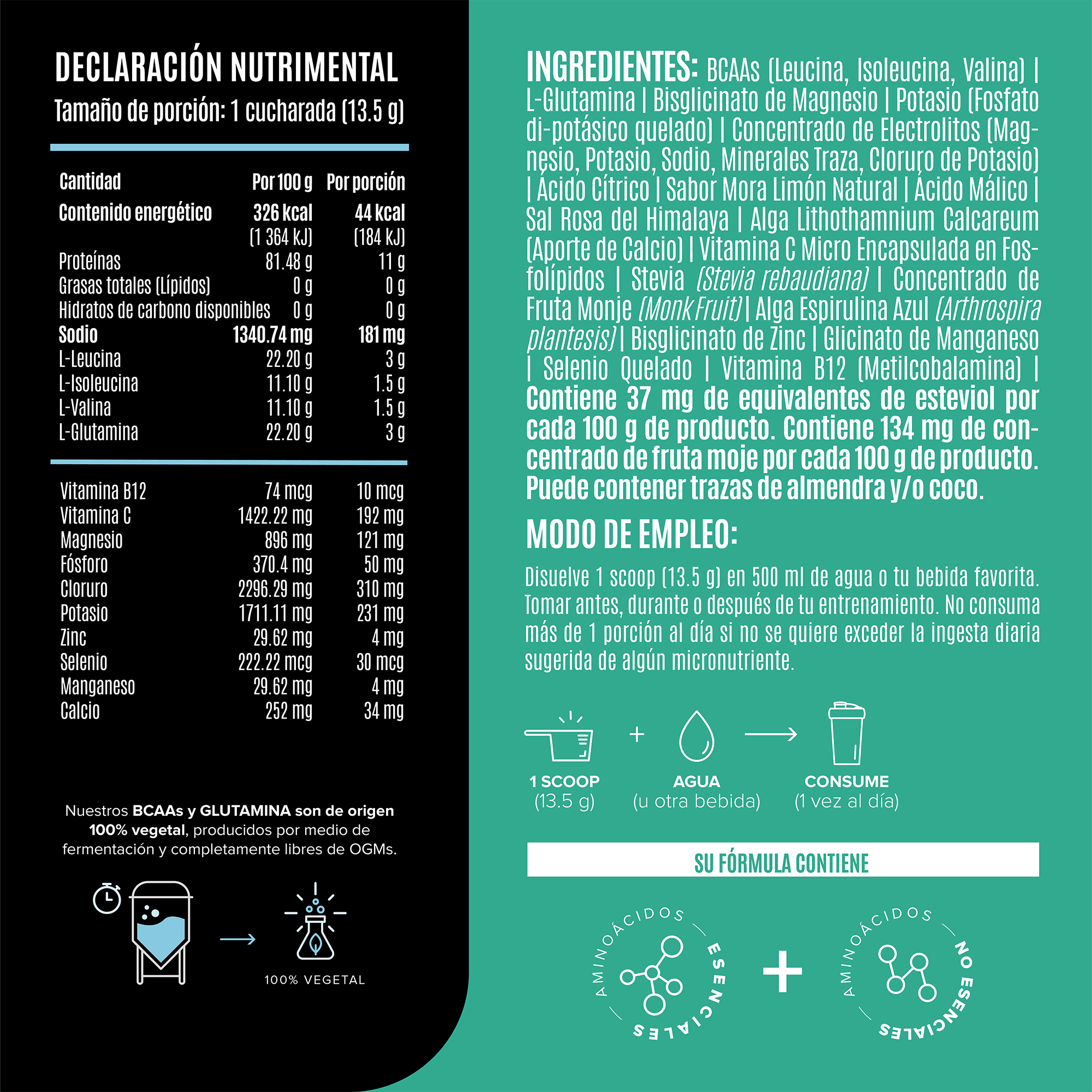 Formulado con aminoácidos de origen 100% vegetal producidos por medio de fermentación y libre de Organismos Genéticamente Modificados (OGM's), es un producto 100% plant-based y apto para dietas veganas, vegetarianas y omnívoras.