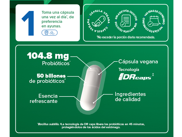 Elaborado con una fórmula limpia y natural, este producto vegano es libre de aditivos ocultos, azúcar, gluten, soya y lácteos. Sus cápsulas de alta calidad, con una esencia refrescante y de fácil consumo, están diseñadas para integrarse cómodamente a tu rutina diaria.