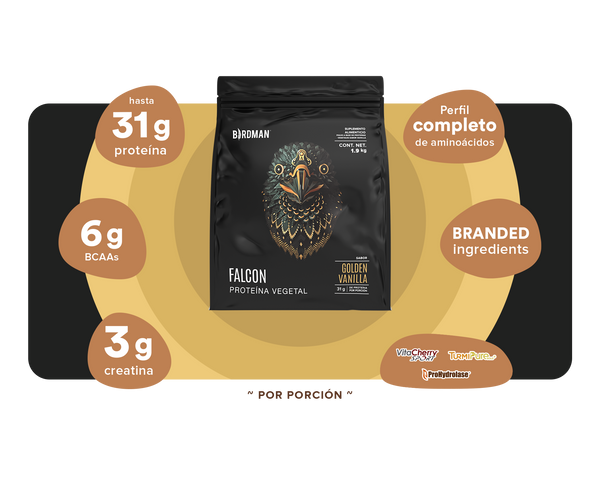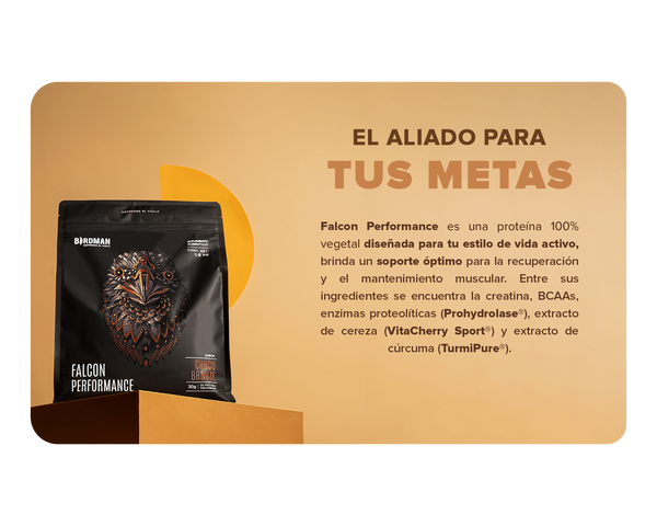 Falcon Performance es una proteína 100% vegetal con creatina, BCAAs, enzimas proteolíticas, extracto de cúrcuma y extracto de cereza, que te apoyará a alcanzar tus metas.