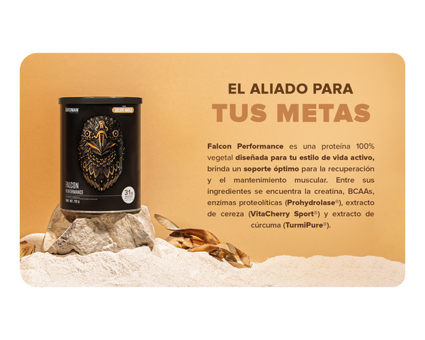 Falcon Performance es una proteína 100% vegetal con creatina, BCAAs, enzimas proteolíticas, extracto de cúrcuma y extracto de cereza, que te apoyará a alcanzar tus metas.