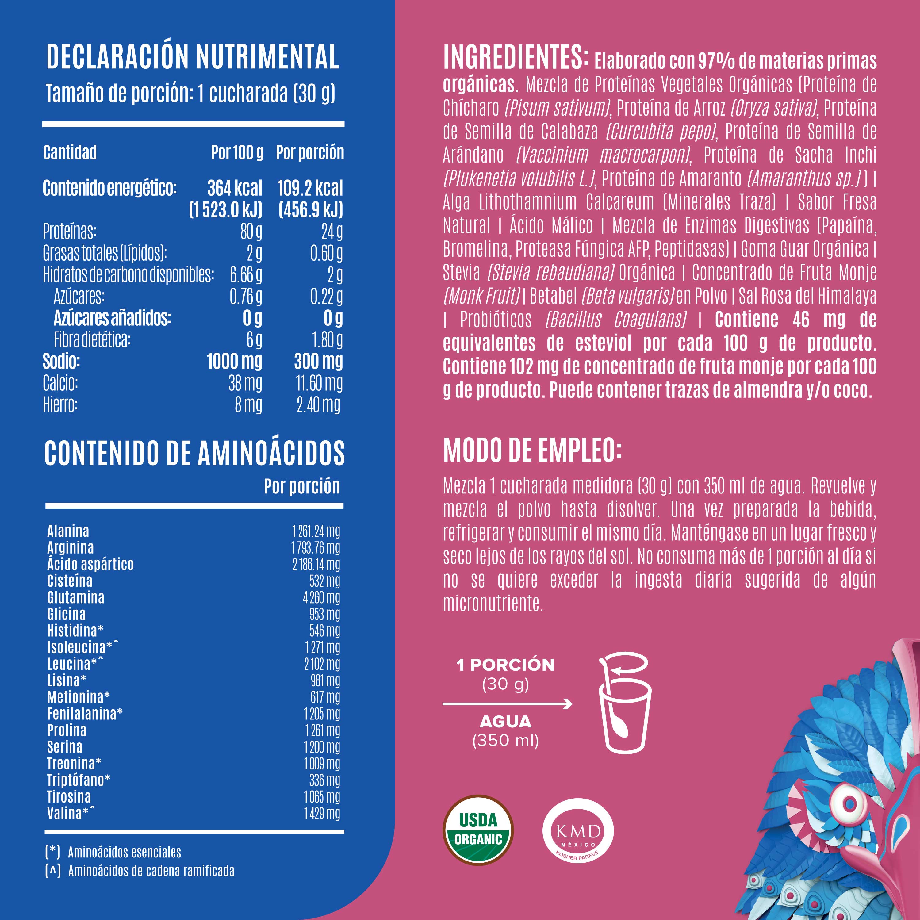 Cada porción de 30 g aporta hasta 24 g de proteína vegetal, es libre de azúcares, gluten, soya y posee certificados USDA Organic y Kosher.