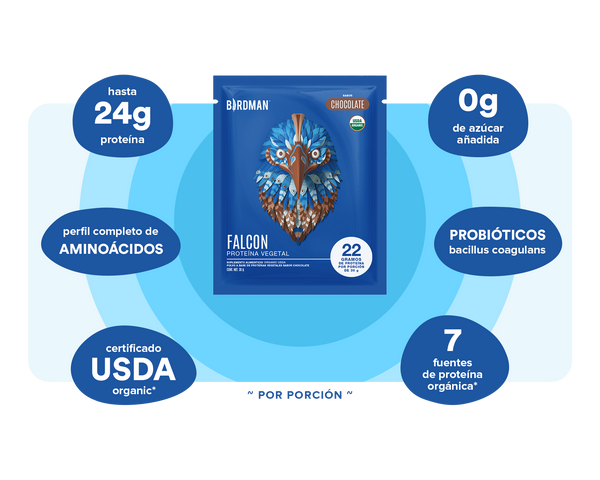 Falcon Protein está diseñada para apoyar tu ingesta de nutrientes diarios y está disponible en sabores orgánicos de chocolate, vainilla, chai, natural y fresa.