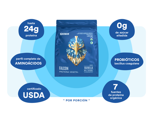 Falcon Protein está diseñada para apoyar tu ingesta de nutrientes diarios y está disponible en sabores orgánicos de chocolate y vainilla.