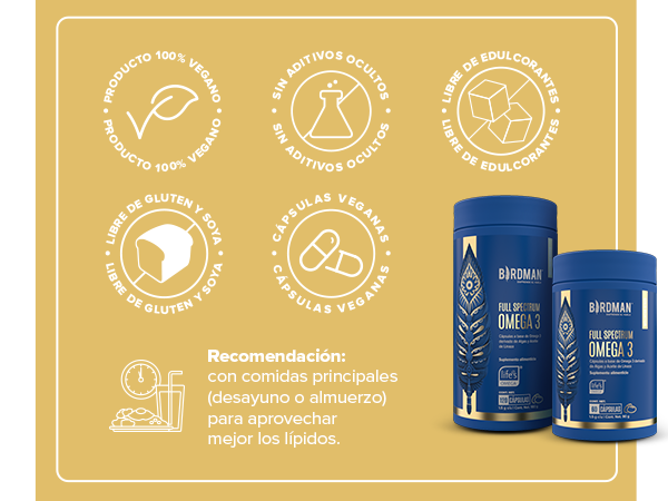 Comprometido con la sostenibilidad, Birdman Full Spectrum Omega 3 es libre de azúcar, gluten, soya y lácteos, lo que lo convierte en una opción plant-based y cruelty free. Elaborado con ingredientes cuidadosamente seleccionados, este suplemento refleja el compromiso de Birdman con la transparencia, ofreciendo una nutrición práctica y consciente que se adapta a las necesidades del estilo de vida moderno.
