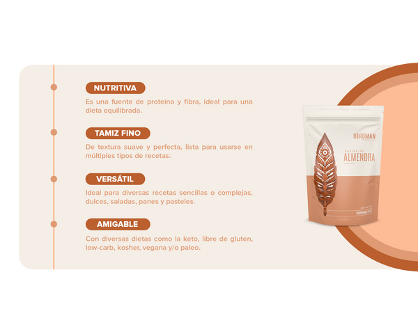 La Harina de Almendras Birdman es más que un simple sustituto de la harina tradicional; es un ingrediente que transformará tus platos, brindándoles un toque gourmet y saludable. ¡Incorpora esta harina en tu próxima receta y disfruta de la bondad natural de las almendras en cada bocado!