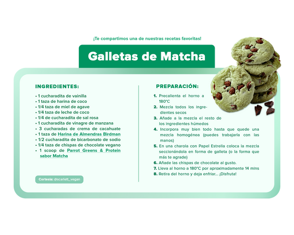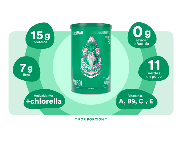 Parrot Greens & Protein es un complemento alimenticio que contiene super alimentos acuáticos y terrestres con alto contenido de verdes, proteína, fibra, y micronutrientes 100% de origen vegetal. Si se te suele olvidar o se te complica consumir ensaladas verdes durante el día, ¡Parrot te puede ayudar! Con sabores Matcha y BerryVanilla, Parrot Greens & Protein es ligero al estómago e ideal para tomarse como colación durante el día. ¡Parrot es nutrición práctica!