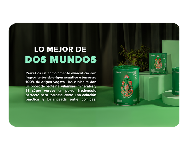 Parrot Greens & Protein es un complemento alimenticio que contiene super alimentos acuáticos y terrestres con alto contenido de verdes, proteína, fibra, y micronutrientes 100% de origen vegetal. Si se te suele olvidar o se te complica consumir ensaladas verdes durante el día, ¡Parrot te puede ayudar! Con sabores Matcha y BerryVanilla, Parrot Greens & Protein es ligero al estómago e ideal para tomarse como colación durante el día. ¡Parrot es nutrición práctica!