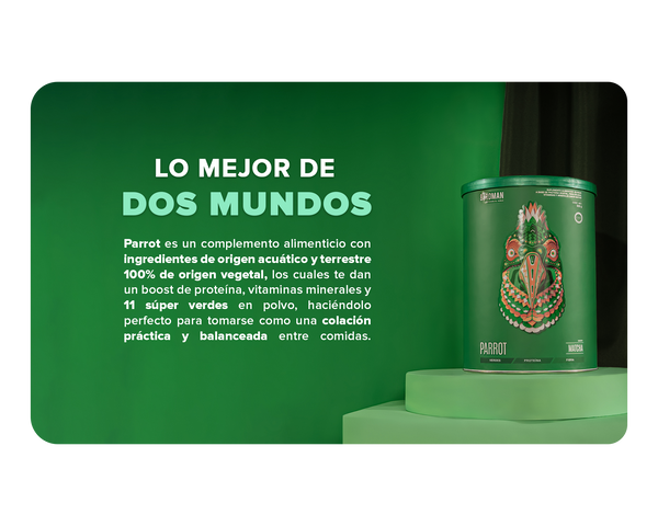 Parrot Greens & Protein es un complemento alimenticio que contiene super alimentos acuáticos y terrestres con alto contenido de verdes, proteína, fibra, y micronutrientes 100% de origen vegetal. Si se te suele olvidar o se te complica consumir ensaladas verdes durante el día, ¡Parrot te puede ayudar! Con sabores Matcha y BerryVanilla, Parrot Greens & Protein es ligero al estómago e ideal para tomarse como colación durante el día. ¡Parrot es nutrición práctica!