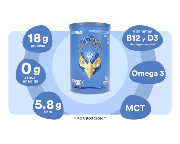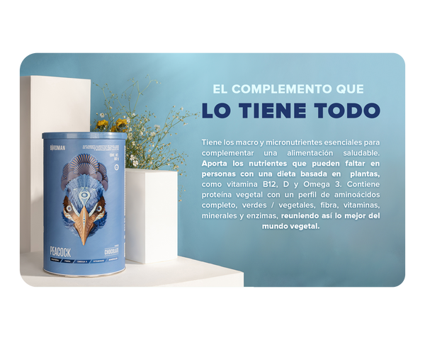 Con Peacock buscamos aportar los macronutrientes típicos de una dieta alta en proteína y los micronutrientes que te ayudarán a complementar tu alimentación para llevar una dieta saludable. Peacock aporta especialmente aquellos nutrientes que tienden a hacer falta en personas que siguen una dieta basada en plantas como Vitamina B-12, Vitamina D y ácidos grasos Omegas 3 y 6. Contiene proteína vegetal con un perfil de aminoácidos completo, verdes/vegetales, fibra, vitaminas, minerales y enzimas. Peacock es un suplemento que ofrece lo mejor del reino vegetal. Disponible en delicioso sabor chocolate y coco-vanilla.