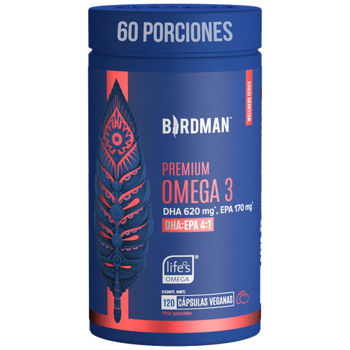 Descubre Birdman Premium Omega 3, un suplemento alimenticio derivado exclusivamente de algas con una proporción óptima DHA:EPA de 4:1. Diseñado para complementar tu alimentación diaria, esta fórmula de origen vegetal es una solución limpia, libre de contaminantes y sostenible, ideal para quienes buscan resultados efectivos y responsables.