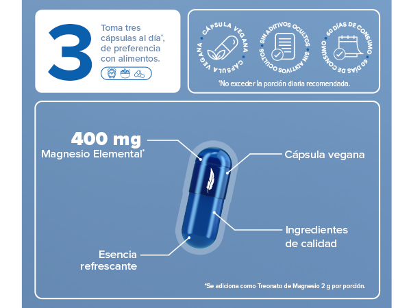 Cada cápsula contiene Treonato de Magnesio en polvo, cuidadosamente elaborado para apoyar a tu alimentación. Su esencia refrescante y practicidad lo hace ideal para quienes buscan un suplemento práctico y agradable al consumo.