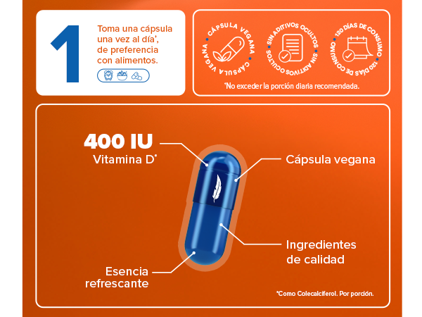 Nuestra fórmula 100% vegetal es libre de ingredientes animales y aditivos, asegurando una experiencia confiable y efectiva. Con 400 UI de Vitamina D3 por porción, este suplemento es una opción práctica y consciente para quienes buscan satisfacer sus necesidades diarias de esta vitamina esencial.